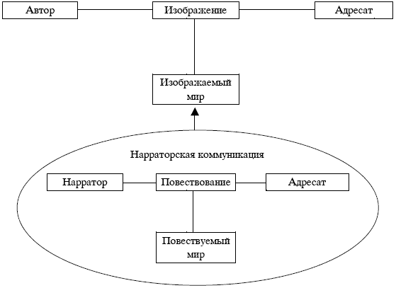 Повествуемый мир – тот мир, который создается повествовательным актом нарратора. Но изображаемый мир, созданный автором, не исчерпывается повествуемым миром. В него входят также нарратор, его адресат и само повествование. Нарратор, им подразумеваемый слушатель или читатель и повествовательный акт являются в фикциональном произведении изображаемыми и, следовательно, фиктивными[49]. Повествовательное произведение – это произведение, в котором не только повествуется (нарратором) история, но также изображается (автором) повествовательный акт. Таким образом, получается характерная для повествовательного искусства двойная структура коммуникативной системы, состоящей из авторской и нарраторской коммуникаций, причем нарраторская коммуникация входит в авторскую как составная часть изображаемого мира[50].