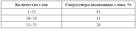 По подсчетам западных исследователей (см. Rescorla 1980)[42], существует следующее соотношение между количеством освоенных ребенком слов и процентом слов, значения которых оказываются сверхгенерализованными.