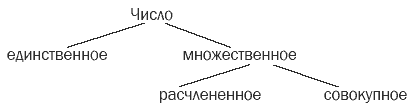 Категория числа применительно к ее основной функции – функции квантитативной актуализации – основана не на одной, а на двух содержательных оппозициях: 1) единичность – расчлененная множественность и 2) единичность – совокупная множественность[57]. Расчлененную множественность будем в дальнейшем именовать просто множественностью, а совокупную множественность – собирательностью. Сказанное выше можно представить следующей схемой: