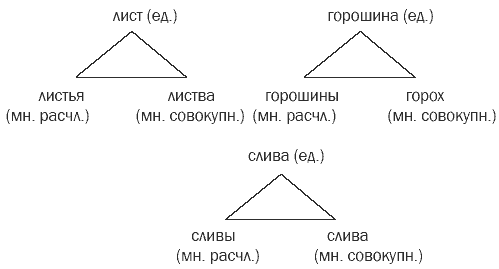 Примеры: «лист» (единственное число) – «листья» (множественное расчлененное) – «листва» (множественное совокупное).