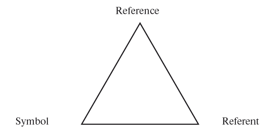 Вершинами треугольника являются акустическая форма слова; некоторое ментальное образование, которое, как правило, называется понятием, и обозначаемый объект (референт или денотат в разных терминологиях). Считается, что понятие, являющееся отражением существенных свойств объекта, определяет тот класс объектов внешней действительности, к которым может относиться данное слово.