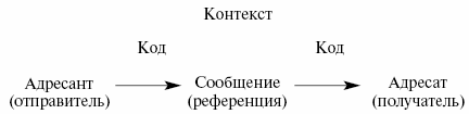 Согласно этой модели основными компонентами речевого акта являются: отправитель (адресант), получатель (адресат), канал связи, сообщение, код, контекст (ситуация).