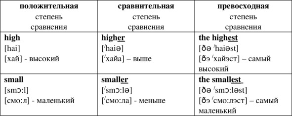 Простые прилагательные образуют степени сравнения путем прибавления суффиксов —er [?] [а] и —est [?st] [аст]. (Здесь как и раньше безударный звук [?] произноситься как среднее между русскими звуками [э] и [а].)