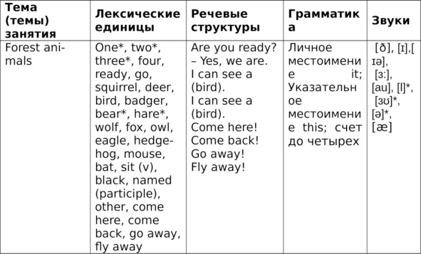 Учитель: Как здесь красиво! В лесу всё удивительно. А знаете, как англичане удивляются? Они говорят [??]. Давайте и мы будем так говорить, если что-то удивительное увидим или услышим. Зденсь, в лесу, разные звуки слышатся. Пчела летит [?] – [?] – [?]. Она язычок между зубами просунула, поэтому у нее такой звук получается. А стрекоза тихо летит [?] – [?] – [?] (этот звук похож на [?], только тихий, вы уже знаете человечка, который играет со своей стрекозой). Вот птичка, совсем маленькая, поет то [?] – [?] – [?] – [?] (как будто икает), то [i?] – [i?] – [i?]. А вот большая птица, она кричит [u] – [u] – [u], наверное, это сова. Ой, слышите, медведь ревет [?: ] – [?: ] – [?: ] – [?: ] (учитель показывает изображения человечков с соответствующими звуками). Что-то страшно в лесу, где водятся медведи. А, это не настоящий медведь, это же наш человечек Englishsound по имени [?: ] с нами в лесу оказался, он маленький, а хочет казаться большим и сильным, поэтому он часто ревёт как медведь в лесу [?: ] – [?: ] – [?: ]. А это что за звук? [r] – [r] – [r] – [r] Неужели тигр? Но ведь тигры в наших лесах не водятся… Да ведь это Englishsound [r] (помните, тот, который рычит, как тигр?). А сейчас, я, кажется, видела гриву льва. Ребята, разве львы в лесу водятся? А, так это же друг человечка [r]. Зовут его [l]. Он частенько переодевается во льва и пытается тоже рычать, как [r], но не умеет произносить звук [r], вместо этого получается [l]. А с ним его друзья, человечек [??] (он всё время удивляется), человечек [?] (он часто кряхтит как старичок [?] – [?] – [?] – [?]), человечек [?: ] (он часто недовольно стонет), и человечек [?] (он все время всех переспрашивает [?]? [?]? (особенно когда его просят что-нибудь сделать).