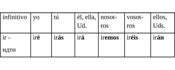 Форма глагола в простом будущем времени изъявительного наклонения (Futuro Simple / Futuro Imperfecto de Indicativo) строится посредством прибавления соответствующих одинаковых окончаний к инфинитивам глаголов всех 3-х спряжений.