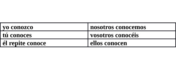 Глаголы с окончанием инфинитива на —acer, -ecer, -ocer, -ucir. Изменения у глаголов данной группы происходят только в форме 1-го лица ед. числа. Последние три буквы окончания инфинитива —cer / -cir меняются на окончание —zco. Во всех остальных лицах эти глаголы спрягаются по общему правилу.