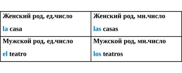 В испанском языке определенный артикль имеет форму женского и мужского рода, единственного и множественного числа.