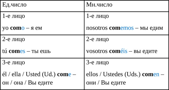Проспрягаем глагол comer – есть. Судя по окончанию -er, он относится к первому спряжению.