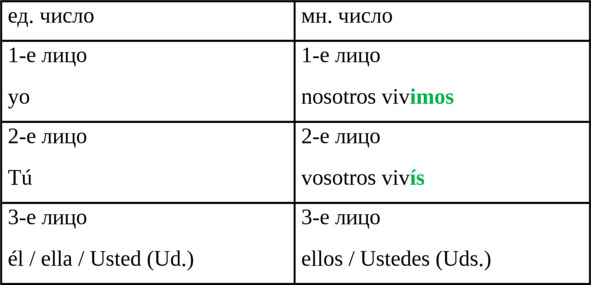Проспрягайте в приведенной ниже таблице глагол vivir – жить, учитывая, что личные окончания глаголов в 3-ем спряжении аналогичны окончаниям 2-го спряжения, кроме форм (nosotros, vosotros):.