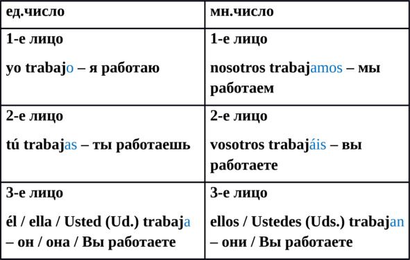 Проспрягаем глагол trabajar – работать. Судя по окончанию -ar, он относится к первому спряжению.