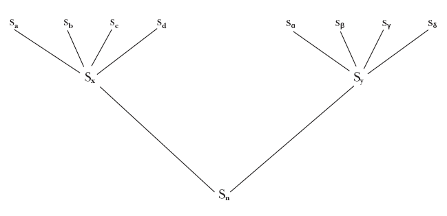 Так вот, вопрос заключается в следующем: если я обнаружу какое-то новое явление, которое поддается описанию в тех же терминах sa, sb, sc, то мне не останется иного выхода, кроме как установить наличие четвертой поверхностной структуры sd, для которой глубинная структура Sx предстанет совокупностью правил ее трансформации в sa, sb и sc. Если же, напротив, передо мной новый феномен, описываемый в терминах модели sd, гомологичной возможным моделям s?, s? и s?, то последние будут приводиться уже не к S, но к новой модели S. В свою очередь Sx и Sy также можно рассматривать как манифестации самой глубинной структуры Sn, как это показано на нижеследующем рисунке.