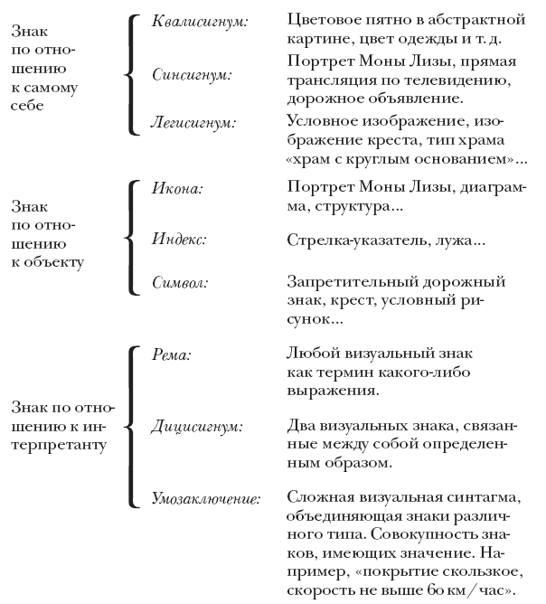 I. 2. Если мы примем во внимание триадическую классификацию знаков, предложенную Пирсом (см. рис. 5), мы убедимся в том, что каждому ее подразделению соответствует определенное явление визуальной коммуникации.