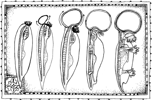 Теория Олдоса Хаксли о том, что произойдет с человеком, способным жить бесконечно, была ошибочной, но не менее упроченная реалиями, чем другая теория, популярная в то время и до сих пор имеющая значительное число сторонников – теория рекапитуляции. Эта теория впервые была предложена немецким натуралистом Эрнстом Геккелем в 1866 г., ее упрощенная формулировка такова: «онтогенез повторяет филогенез»; подразумевается, что каждое создание в своем индивидуальном развитии проигрывает историю развития жизни вплоть до момента появления данного конкретного вида. Например, жизнь человека начинается с зачатия в виде небольшой клетки – так зарождалась сама жизнь, затем эмбрион проходит несколько стадий, в которых он напоминает сначала рыбку (даже развивает жабры), затем млекопитающее с хвостом и превращается в конце концов в «более продвинутое» существо, каким и является человек.