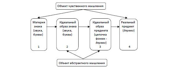 Так как мышление человека функционирует на двух уровнях – чувственном и абстрактном, и так как знаки языка проходят через обе эти фазы мышления, то фактически в мышлении объединены четыре сущности – две материальные, вещественные и две идеальные, абстрактные, потому что знак и внешний предмет одновременно и материальны, и идеальны. Вот эти четыре уровня: (1) звуки, буквы как физическая материя (уровень чувственного мышления); (2) идеальное от материи знака (фонемы, графемы); (3) идеальный образ от отражаемого реального материального внешнего предмета (4). Идеальное от материи знака (2) совпадает с идеальным от материи внешнего предмета (3), например, идеальная форма цепочки фонем дерево (2) совпадает с понятием предмета дерево (3), но только по названию, а не по их сущности – слово дерево не есть само дерево. Связь в мышлении происходит только между двумя абстрактными, идеальными, логическими образами (от знака и от предмета) на уровне абстрактного, логического мышления как переход с уровня (2) на уровень (3). На уровне же чувственного мышления мы видим, ощущаем, воспринимаем только физическую реальность – звуки и буквы слова (1) и реальный внешний предмет дерево (4). В мозгу они соединяются ассоциативной логической связью как переход с уровня фонем (2) на уровень понятий (3).