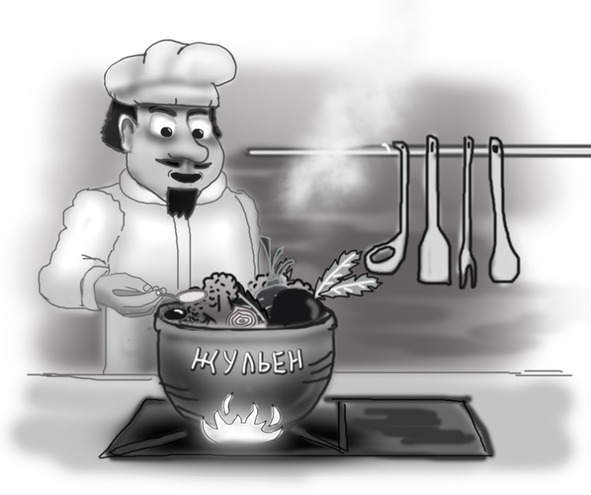 Любезный официант немного удивился и попросил подождать. Примерно через час нам принесли две тарелки… с овощным супом. Гарсон извинился: мол, жульены в это время года заказывают очень редко, так что пришлось послать в овощную лавку за нужными ингредиентами (у них, у буржуев, это всегда практиковалось, поэтому в меню никогда ничего не заканчивалось).