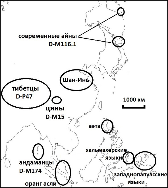 Рис. 1. Локация основных языков айнско-тибетско-андаманской семьи, генетические маркеры доказывающие связи популяций, а также перспективные направления поисков других языков родственных семье.