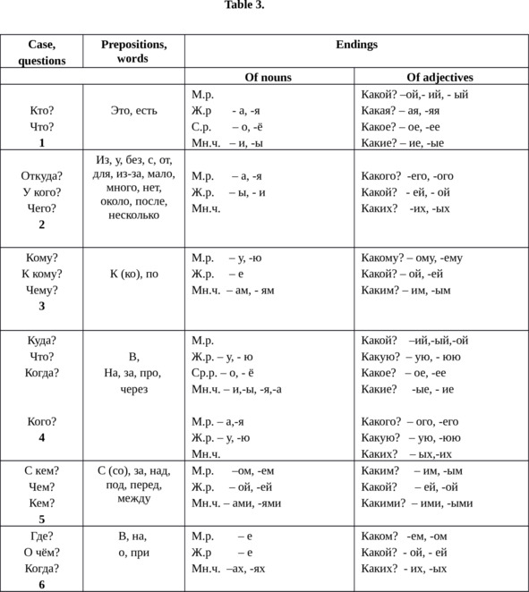 In table 3 you can find all endings of all nouns and adjectives in relation to their gender, number and case