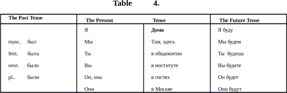 The question “Вы где?” (“Where are you?”) refers to the action taking place in the present. When answering this question, the verb “быть” is missing. For example: – Ты где? – Я на работе. In the Past Tense the suffix —Л is added to the verb. Я был на работе. (masc.gen.). Я была на работе. (fem.gen.). Мы были на работе. (pl.). In the Future Tense the verb changes in relation to a pronoun. For example: Я буду на работе. Ты будешь на работе. Она будет в университете? You can see all variants in table 4. When in a question the verb “быть” is in the Past Tense, you should use the Past Tense in a reply. When in a question the verb “быть” is in the Future Tense, you should use the Future Tense in a reply. For example: – Где ты был? (Where were you?) – Я был дома. (I was at home.) Or: – Где ты будешь завтра утром? (Where will you be tomorrow morning?) – Я буду завтра утром в университете. (I’ll be at the university tomorrow morning.) After the verb “быть” should be used a noun in case 6.