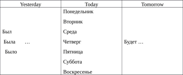 Вчера был вторник? Сегодня вторник? Завтра будет вторник? The table lists the answers to these questions.
