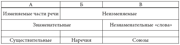 Единицы группы Б представляют собой промежуточную группу между знаменательными и незнаменательными словами. Так, и наречия, и предикативы почти не изменяются, и в этом смысле ученые лишены морфологических критериев для разграничения данных частей речи[24]. С другой стороны, наречия не занимают монопольного положения в структуре предложения: типичная для них обстоятельственная позиция регулярно замещается и другими частями речи (Он приходил к нам вечером / вчера // в понедельник / на прошлой неделе). Таким образом, при выделении наречий не отмечается такой прямой связи между синтаксической функцией и частеречными характеристиками, как у слов группы В. Однако другой признак частеречной классификации – семантический («обобщенное значение, характеризующее все слова той или иной части речи» [Русская грамматика 1980]) – позволяет оперировать довольно строгими параметрами и отделять в контексте наречия «вдаль», «наверх», например, от предложно-падежных сочетаний «в даль» и «на верх». Ведущим классообразующим критерием и для наречий, и для предикативов необходимо считать единство общекатегориального значения и синтаксической функции. Исходя из этого, случаи типа до смерти, на цыпочках и другие вписываются в круг единиц, относящихся к наречиям.
