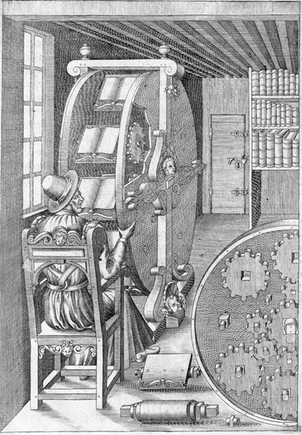В 1588 году итальянский инженер Агостино Рамелли придумал книжное колесо (book wheel), предназначенное для одновременного доступа к нескольким книгам на библиотечных полках. Правда, машина не была создана – осталась лишь проектом, хотя похожие приспособления впоследствии использовались в монастырских библиотеках.
