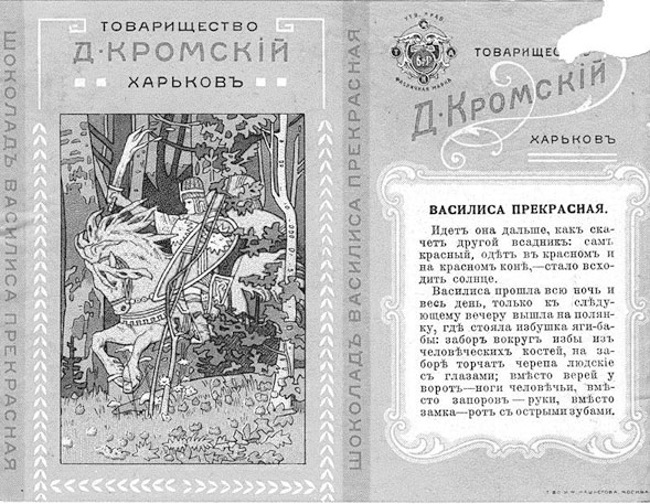 Наверное, раньше всего из названного появилась «литературная» реклама – обыгрывание книжных сюжетов и художественных образов в продвижении товаров. Так, знаменитое дореволюционное «Товарищество „Жорж Борман“» выпускало леденцы с портретами русских писателей и цитатами из их произведений. Кондитерская фабрика «Большевик», в позапрошлом веке именовавшаяся «С. СГУ и К°», производила «конфекты» «Гоголь» с иллюстрациями и фрагментами повестей, фирма «Динг И. Л.» – шоколад «Стихотворения Некрасова» с поэтическими отрывками, Торговый Дом «Каргин И. В. и Савинов А. А.» (нынешняя шоколадная фабрика «Россия») поставляла сладкоежкам карамель «Отелло». А владелец «Паровой фабрики конфет, пряников и макарон» Д. Кромский догадался запустить производство шоколадок с фрагментами сказки «Василиса прекрасная», которые надо было собрать и составить из них целый текст.