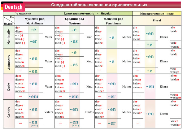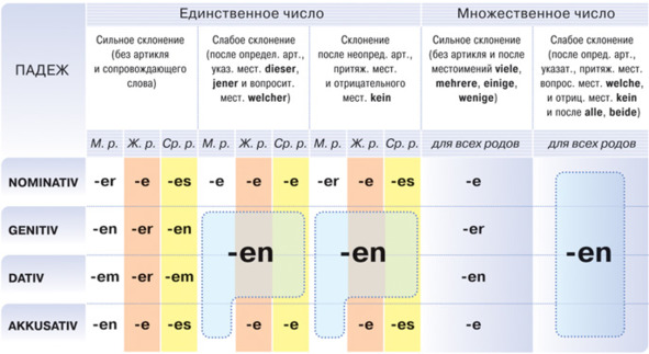 Если в предложении имя прилагательное описывает субстантивированное прилагательное (Der Deutsche, Die Kranke, Die Verwandten), то окончание определения подбирается по общему правилу: либо само прилагательное (определение), либо сопровождающее его слово должны определить род, число и падеж существительного. Род, число и падеж показываются в словосочетании один раз. При этом субстантивированное прилагательное получает нейтральные окончания <—е> или <—еn>: