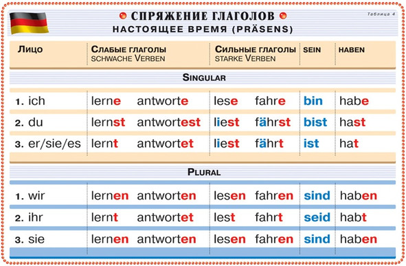 Глаголов, так меняющихся в корне, немного, их следует запоминать так: fahren (ехать) – er f?hrt; laufen (бежать, идти пешком) – er l?uft; sprechen (говорить) – er spricht; nehmen (брать) – er nimmt; sehen (смотреть) – er sieht; lesen (читать) – er liest, du liest; essen (кушать) – er isst, du isst … (в последних двух случаях формы ты и он одинаковы, так как -s— уже есть в самом корне слова).