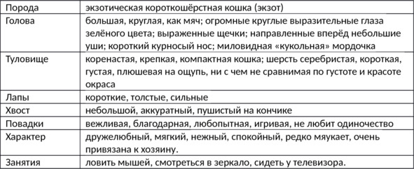 «Экзоты характеризуются, прежде всего, большой схожестью с кошками персидской породы. Экзотов иногда называют „персидской кошкой для ленивых“ из-за того, что с одной стороны они очень похожи на персов, но при этом не требуют такого пристального внимания к уходу за своей шерстью. Шерсть – это основное отличие экзота от перса. Шерсть у экзота короткая, около двух сантиметров длиной, невероятно густая и плюшевая на ощупь. На сегодняшний день экзотическая короткошерстная кошка, благодаря своему удивительному характеру и милому, детскому выражению лица, входит в десятку самых популярных пород мира» (Из Википедии).