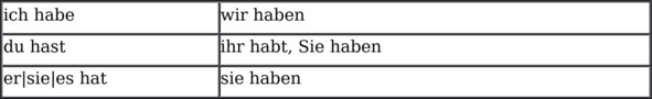 Ещё один глагол первостепенной важности (haben – [ХАБН]), «иметь» спрягается следующим образом:
