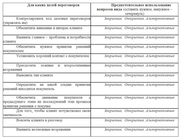 Когда-то нужно клиента разговорить, когда-то ограничить его чуть неумеренную болтливость, а когда-то помочь ему принять решение. И для каждого случая лучше подойдет вопрос того или иного вида – вопросы нужно задавать по ситуации.