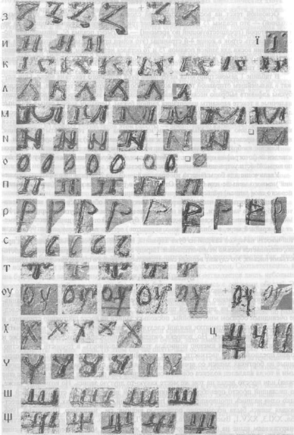 «…В таблице 1 мы стремились отразить как можно больше замеченных вариаций в начертании одной и той же буквы. Несмотря на это, бросается в глаза, напротив, чрезвычайная устойчивость начерков каждой из букв алфавита, на фоне которой варьирование, как правило, оказывается весьма незначительным. Наряду с собственно каллиграфическими достоинствами письма, это служит верным свидетельством высокого профессионализма писца…»6