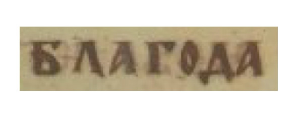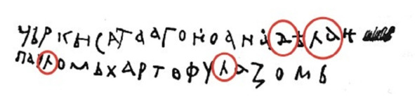 Правилу написания греческих «прототипов» соответствует только буква А, тогда как графика букв Д и Л изменилась: в надстрочный элемент переходит не правая, а левая их черта. Данная особенность показывает, что среди этих трех букв «наследуемой» графикой обладают лишь буквы Д и Л, причем в приведенном изображении буквы Д сохранен даже нижний ограничитель левой наклонной линии буквы Л. Такое изменение графики вполне могло бы быть всего лишь ошибкой конкретного новгородского писаря, но точно такое написание буквы Л можно встретить в самых древних на сегодняшний день «кириллических» надписях на плитах собора болгарского царя Симеона, датируемых 893 годом, при том что буква Д в той же надписи соответствует греческому варианту ее написания. То, что это не еще одна случайная описка, а правило, подтверждает троекратное одинаковое написание буквы Л: