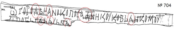 Грамота №704 расширяет список рассматриваемых букв до четырех, ведь она дополнительно содержит букву ?, которая выглядит как видоизмененная буква Л, точно так же, как и в «Новгородском кодексе». И это несмотря на более чем двухсотлетнюю разницу между временем написания этих письменных памятников!