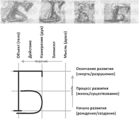 Графика буквы Б основана на графике буквы Г, что хорошо видно по изображениям «Новгородского кодекса». Это говорит о том, что образ рассматриваемой буквы связан с физическим ограничением/физическим пределом развития. На первом, втором и третьем изображениях, представленных выше, угадывается нижний ограничитель ЛБЭ и оторванность полукруглого элемента от него. Этим обусловлена прорисовка данной буквы в матрице. Изменение графики на современный лад не поменяет ее смысл, но не позволит полностью понять ее основной смысловой элемент: полукруг в нижней части.