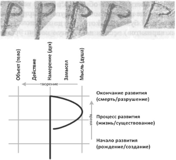 Примечательно, что информация, изображаемая полукруглым элементом, достигает своего максимума (точка касания «линии души») примерно в то же время, в которое кривая в графике буквы К касается «линии духа». Вряд ли это простое совпадение, слишком уж о похожих и связанных понятиях идет речь в образах этих букв. Если в образе буквы К речь идет о тяготении замыслов к уровню намерения, то в графике буквы Р речь идет о возрастающей внутренней силе живого существа, которая позволяет его мыслям превращаться в намерение.