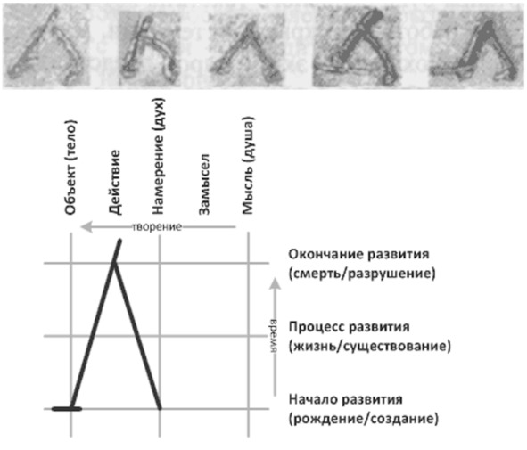 Как мы уже отмечали выше, графика «кириллической» буквы Л отличается от своего греческого «прототипа». В изображении этой буквы из «Новгородского кодекса» в надстрочный элемент переходит ЛБЭ, а не СБЭ, и именно на «тело» смещен смысловой акцент. В греческой же «лямбде» акцент смещен на «дух». С одной стороны, графика греческой буквы более обоснована, ведь именно «дух» не ограничен временем жизни «тела», но с другой стороны, в греческих буквах нет четко формализованной системы ограничителей, которую мы уже увидели в графике рассмотренных букв. Верхний ограничитель ЛБЭ в графике «кириллической» буквы Л отсутствует, значит, в область матрицы попадает лишь время жизни «тела», а не все время его существования вплоть до физического разрушения. С учетом этого уточнения выход ЛБЭ за верхнюю направляющую матрицы становится вполне допустимым. Вместе с тем, как мы уже видели в графике других букв, «дух» не прекращает свое развитие в момент смерти «тела», а продолжает развиваться до момента его физического разрушения. В графике рассматриваемой нами буквы это развитие не показано, в чем видится явное несоответствие образам других букв азбуки. Однако если бы выше линии смерти продолжались оба базовых элемента, то выбрать из них главный смысловой было бы невозможно. Продолжение развития «духа», на наш взгляд, в графике буквы не показано вполне осознанно с целью явного смещения смыслового акцента образа буквы на «тело». Мы не вправе говорить за греческий язык, возможно, для его слов графика буквы ? является правильной, но для русских слов, зачастую использующих в своих словах образ вертикального человеческого тела, по нашему мнению, правильным является именно изображение буквы Л из «Новгородского кодекса». Ниже мы обязательно приведем примеры, подтверждающие это наше утверждение.