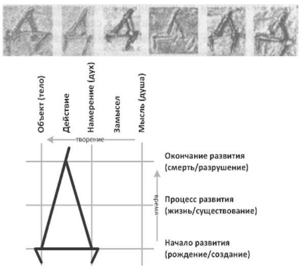 Образ живого существа, передаваемый буквой Л, дополняется «подставкой», на которой это «живое существо» стоит. Нижняя горизонтальная черта расположена на «линии рождения», а подстрочные элементы начинаются по времени матрицы чуть раньше и расходятся от вертикальных направляющих. На наш взгляд, они символизируют наследие, которое получает живое существо при рождении. Это может быть как материальное (левый подстрочный элемент), так и духовное (правый подстрочный элемент) наследие. Под «материальным наследием» мы здесь подразумеваем как недвижимость, деньги и тому подобное, так и физические особенности организма. Под «духовным наследием» мы понимаем, например, традиции народа, в котором живому существу довелось родиться.