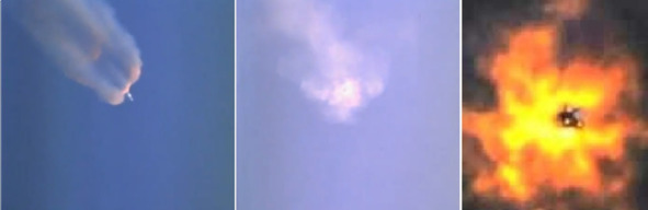 Простакам эти взрывы выдают как момент срабатывания РДТТ торможения первой ступени, которые находятся в хвостовой части этой самой ступени и направлены почти по направлению движения ракеты. Выброс из твердотопливных двигателей небольшого размера не могла образовать огромные облака пламени и дыма высокой плотности, а уж тем более череду таких вспышек: 3—4, как минимум. Такие глупости нет необходимости рассматривать и обсуждать.