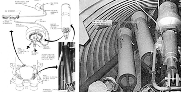 Описание этих РДТТ, версия НАСА: «Тяга каждого тормозного РДТТ около 38 т (зависит от температуры), эффективное время работы 0,67 секунд». «Наиболее крупными являются тормозные РДТТ первой ступени; их высота 2,24 м, диаметр 0,39 м, масса 228 кг (в том числе 126 кг топлива). Наименьшие РДТТ, обеспечивающие «осадку» топлива в баках третьей ступени, содержат по 27 кг топлива. [5]