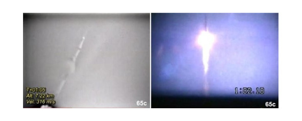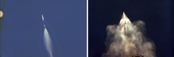На этих кадрах выбросы или пламени или горючего из сопла «двигателей» первой ступени демонстрируют тот, факт, что все это событие произошло при нормальном атмосферном давлении. В разряженной атмосфере аналогичные выбросы создают расширенный большого размера «купол».