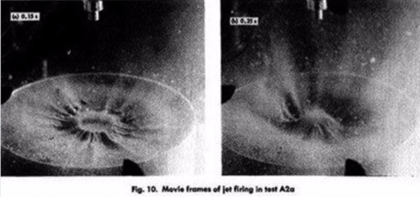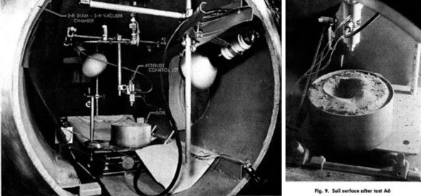 Оказывается, американские исследователи НАСА исследовали эту проблему. В НАСА была создана вакуумная камера, в которой был установлен макет ракетного двигателя над чашкой песчаного грунта. Тест проведен в рамках подготовки полета «Аполлон-6».