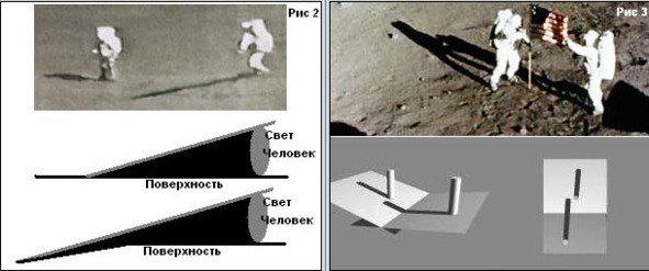 Защитники лунного обмана нашли «оправдание» этому необычному изображению с разными длинами теней. Это, по их мнению, различие теней вызвано неровностью грунта «Луны». Пропагандисты американского обмана при этом демонстрировали картинку, где объясняется этот процесс.