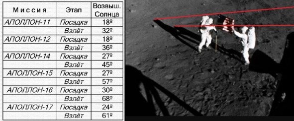 Рене о возвышении «Солнца» на фотографии НАСА: «На последней фотографии, где Олдрин и Армстронг чествуют флаг, тени произведены Солнцем, стоящим на высоте 34,9 град. над горизонтом. Максимальное возвышение Солнца в той экспедиции составляло 32 град., но разница в 2,9 град. явно недостаточна, чтобы делать какие-то выводы. Однако, если учесть, что церемония поднятия флага является чуть ли не первым действием после каждой высадки, и происходит в течение первых часов, то можно с уверенностью утверждать, что Солнце во время съемки находилось на высоте порядка 22 град. Проведенные вычисления вполне могут разбить утверждения NASA о реальности высадки астронавтов на Луне». [1]
