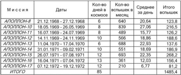 Самым важным моментом книги Рене, наверное, необходимо признать его попытку исследовать защиту от радиации у «космических аппаратов» из программы «Аполлон». Здесь все было прекрасно: никакой защиты от солнечных вспышек у американцев не было. Этот факт признавали сами фальсификаторы. Рене составил таблицу возникновения солнечных вспышек с период осуществления «лунных полетов».