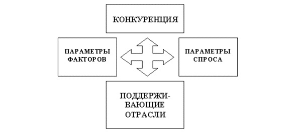 Ниже представлено описание модели М. Портера, получившее название «Национальный ромб», которую можно отнести к инструментам описания промежуточного слоя внешнего окружения фирмы (если рассматривать фирму и ее окружение в виде планетарной модели). «Промежуточного» слоя между средой прямого и средой косвенного воздействия на бизнес.