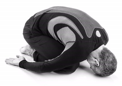 Nast?pnie odpu?? napi?cie, zamknij oczy, zr?b sk?on, opieraj?c czo?o na pod?odze, r?ce u??? wzd?u? cia?a (fot. 3). Nie martw si?, je?li nie mo?esz si?gn?? czo?em do pod?ogi, w?wczas po prostu pochyl si? na tyle, na ile b?dzie to dla ciebie wygodne. Odpocznij przez chwil?, zwr?? uwag? na sw?j oddech. Staraj si? kierowa? go w doln? cz??? plec?w.