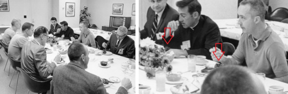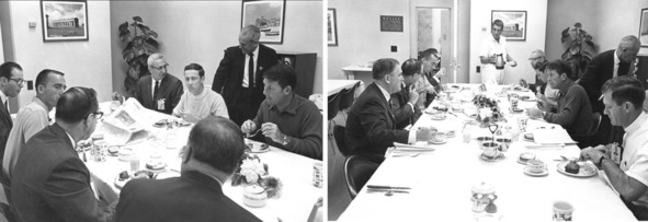 Фотографии НАСА, подпись: «Космонавты „Аполлон 7“ завтракают с представителями НАСА. Уолтер Каннингем, второй слева; Донн Ф. Эйзель, второй слева через стол и Уолтер М. Ширра-младший, рядом с Эйзель. Кеннет Кляйнкнехт». [14], [15]