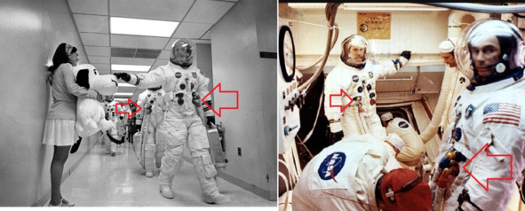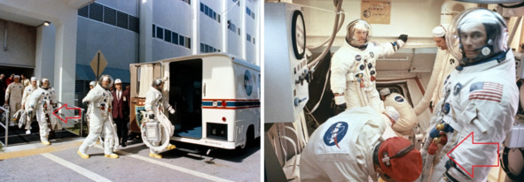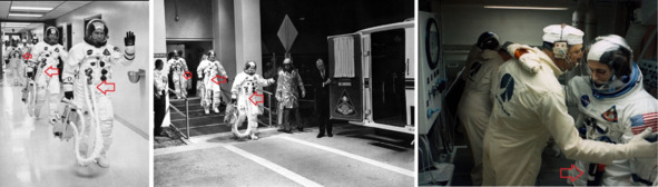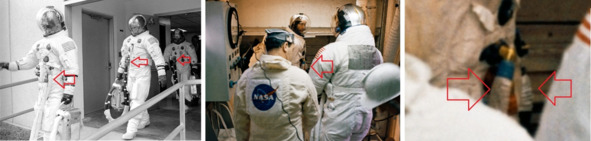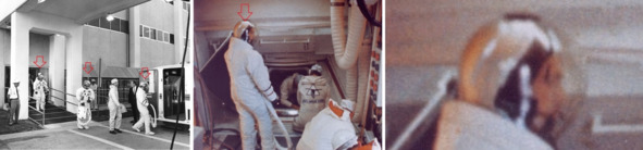Сравнение костюмов на старте и костюмов «космонавтов» США в американском космосе тоже выявляют ряд несоответствий. Первая фотография s68—55999, космонавты идут к автобусу. Эмблемы на костюмах справа и слева хорошо наблюдаются, указатели стрелкой показывают их место расположения.