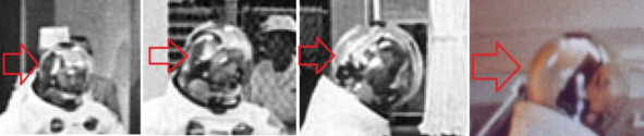 Фотография НАСА «KSC-68PC-190 October 11, 1968» в центре и увеличенный фрагмент демонстрируют, что сбоку шапочка стала белой на большой площади шапочки. На фотографии изображен «космонавт» США в Белой Комнате»